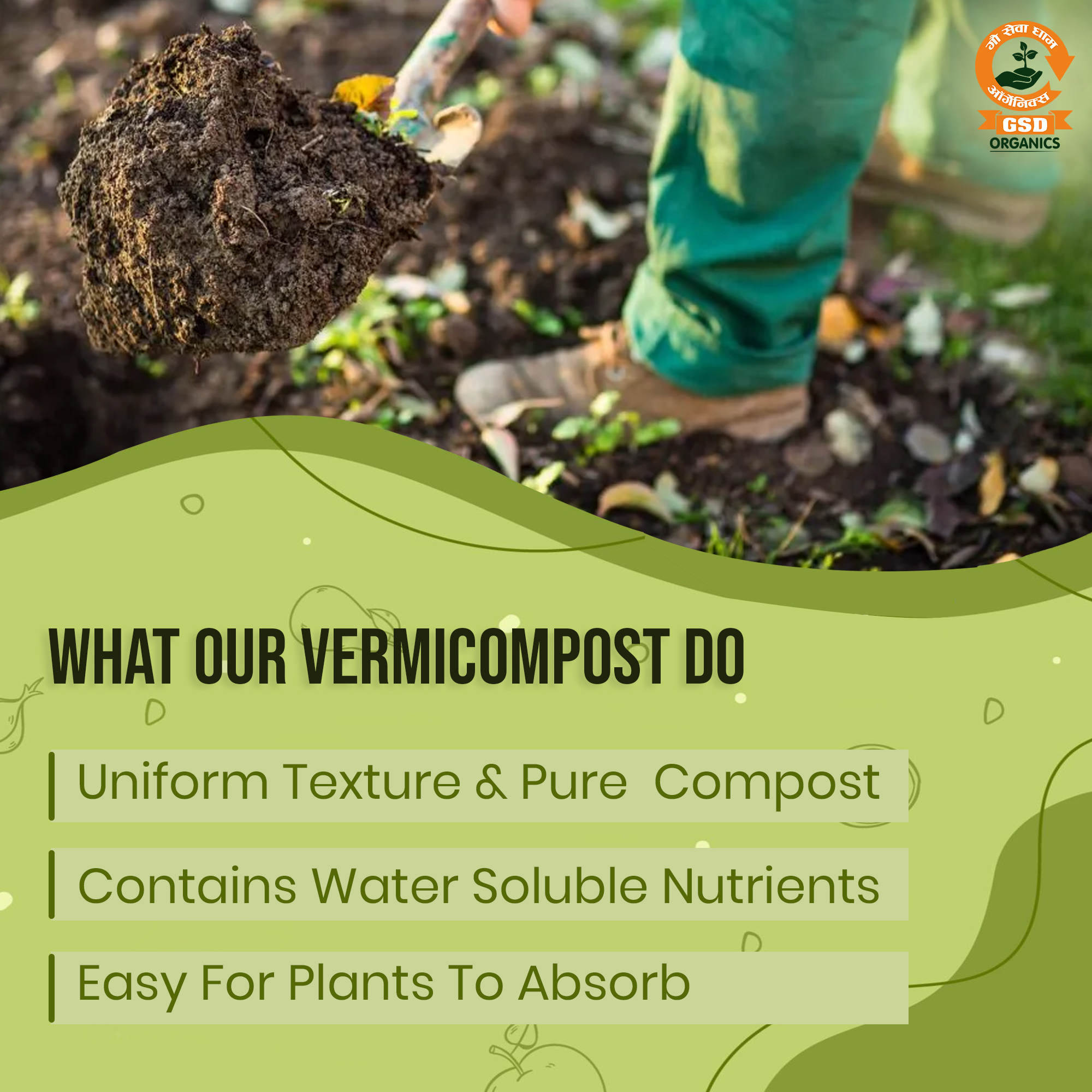 GSD Organics Premium Vermicompost is a nutrient-rich, fully organic fertilizer created through the natural process of vermiculture using Eisenia fetida earthworms. This compost enhances soil structure, improves aeration, and increases water retention, creating an ideal growing environment for all types of plants. Packed with essential nutrients like nitrogen, phosphorus, potassium, and trace minerals, it strengthens root development and supports higher crop productivity.