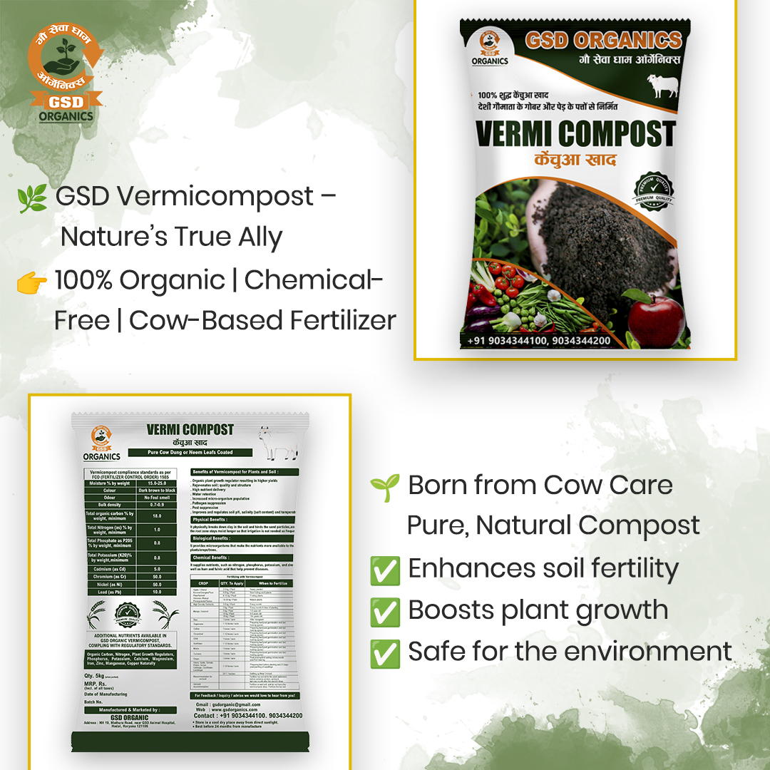 Free from chemicals and pesticides, GSD Vermicompost restores soil vitality, promotes microbial activity, and helps plants resist diseases naturally. Suitable for use in fruit orchards, vegetable farms, gardens, nurseries, polyhouses, and greenhouses. It’s an all-purpose organic manure designed to improve soil health, ensuring sustainable agriculture and long-term fertility.